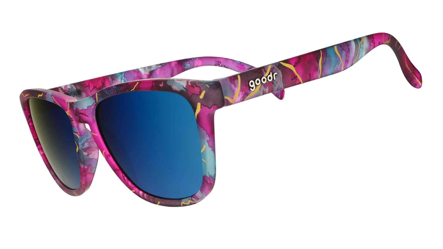 Estos magníficos lentes originales multicolor con efecto acuarela presentan tonos saturados de púrpura, verde azulado y toques dorados, junto con lentes reflectantes en verde azulado. El diseño se inspiró en el arte japonés del Kintsugi, que celebra la belleza en la imperfección.