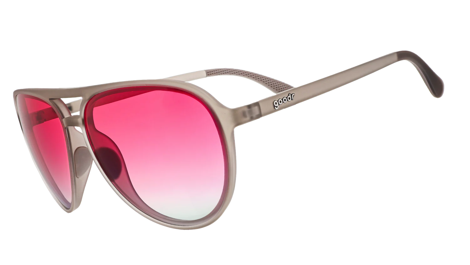 ¡Destaque entre la multitud con unas lentes de sol en tonos joya! Estas monturas de aviador grises tienen lentes antirreflejos en degradado rosa. Son perfectas para caminar por senderos en condiciones de poca luz... o para alejarse de un robo en un casino con un montón de piedras en el bolsillo.